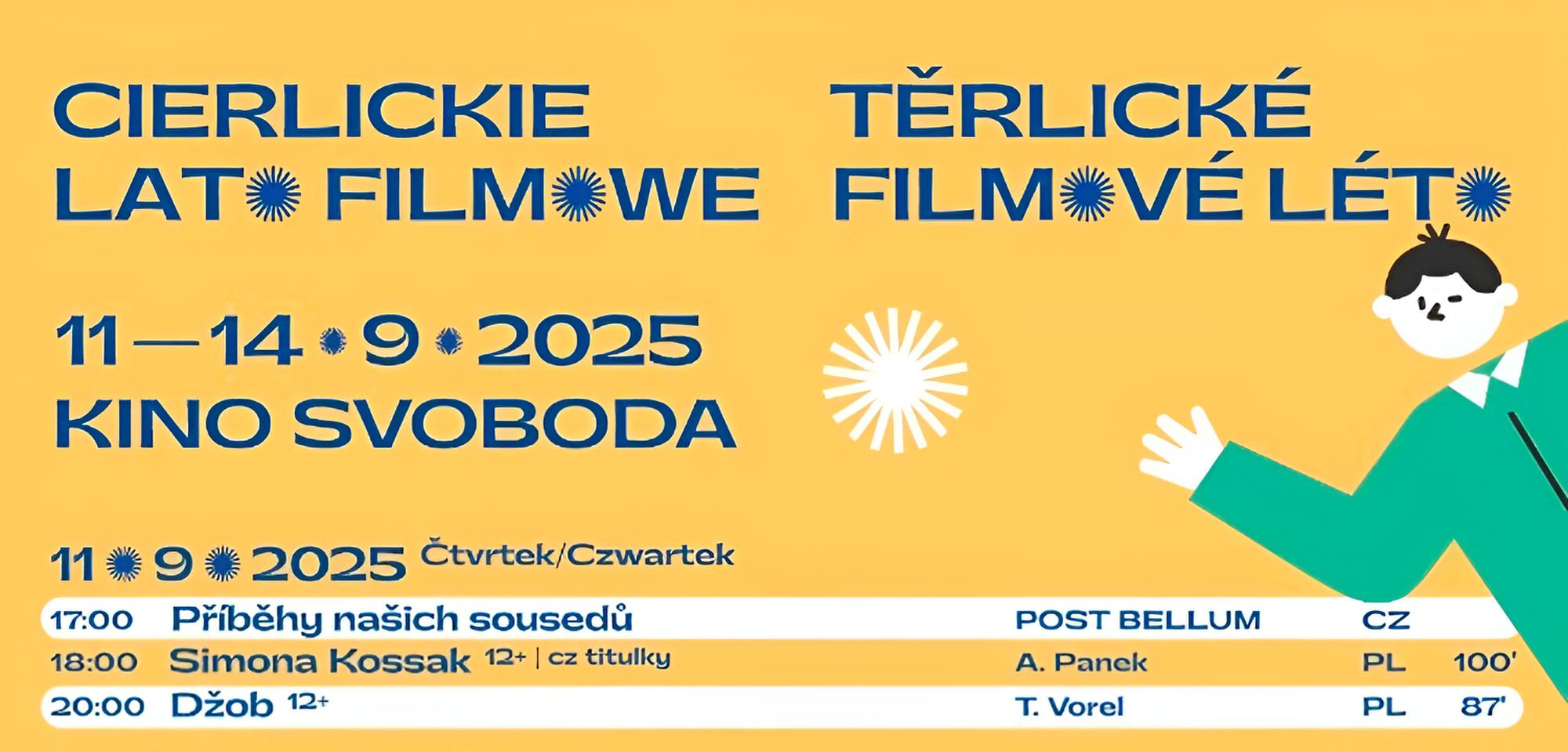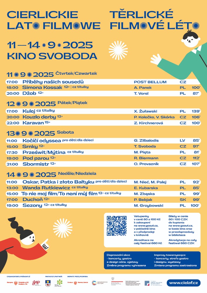W dniach 11-14 września 2025 r. zapraszamy do Kina Svoboda na kolejną edycję Cierlickiego Lata Filmowego. Program wydarzenia obejmuje cztery dni pokazów filmowych, w których znalazły się produkcje z Polski, Czech, Słowacji i innych krajów regionu, a także seanse dla dzieci, filmy dokumentalne oraz kino fabularne.