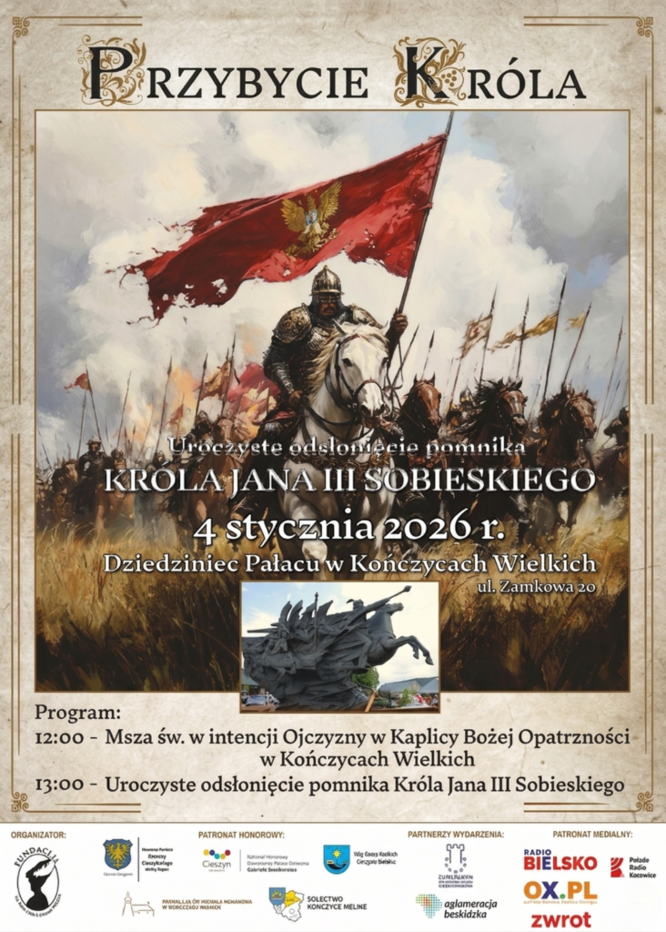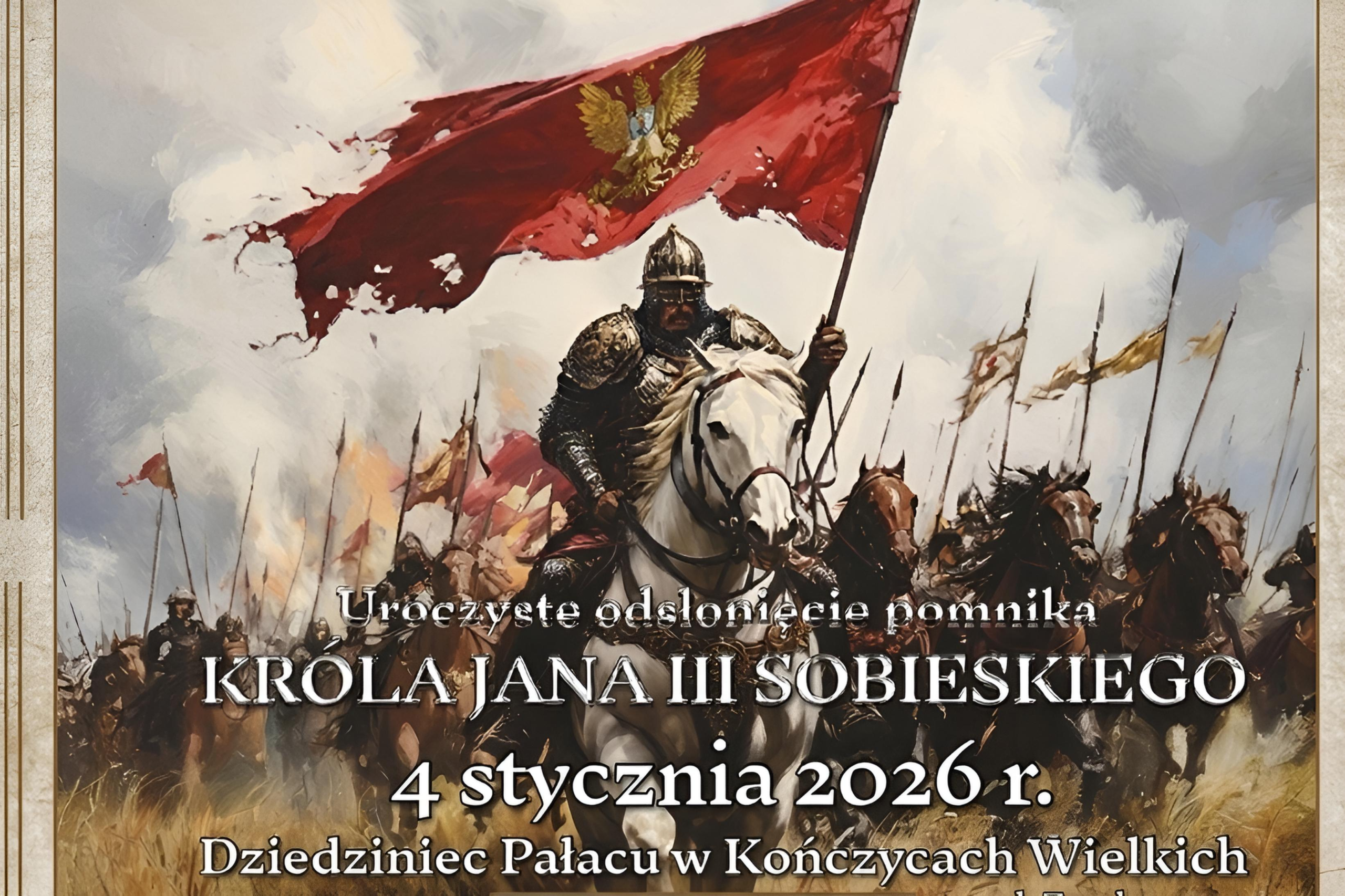 W niedzielę 4 stycznia 2026 r. w Kończycach Wielkich odbędzie się uroczyste odsłonięcie pomnika Króla Jana III Sobieskiego. Wydarzenie będzie miało miejsce na dziedzińcu Pałacu w Kończycach Wielkich przy ul. Zamkowej 20.